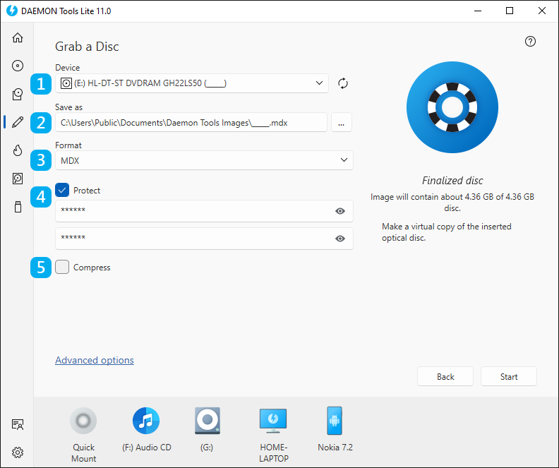 The basic options are adjusted, so now you can click Start button and begin creating an image. Also, you can set Advanced options. Note that adjusting advanced options of Grab a Disc feature is a part of Image Editor paid group. Learn more about the features included in Image Editor group in the relevant article.