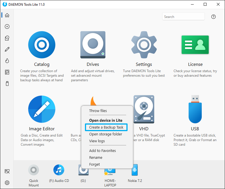 First of all, you need to download and install Catch! from Google Play or App Store, and make sute that the mobile device is connected to the same network that PC is. Once the device appears in device panel in DAEMON Tools Lite, you can open its contextual menu, and pick Create a Backup Task: